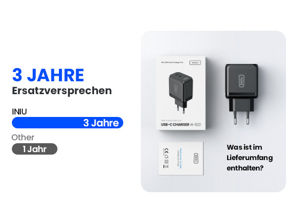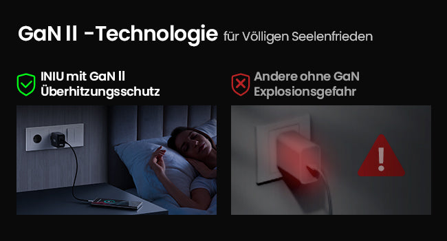 Die proprietäre GaN Ⅱ-Technologie von INIU schützt Sie und Ihre Geräte, indem sie die Temperatur über 3,2 Millionen Mal pro Tag intelligent überwacht und Sie und Ihre Geräte so vor der Gefahr von Feuer und Batterieschäden bewahrt.