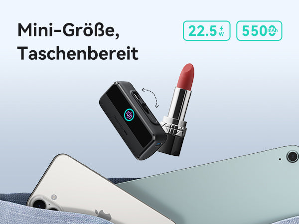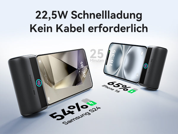 - [22,5 W Schnellladung, kein Kabel erforderlich] Mit der 22,5-W-Schnellladefunktion laden Sie Ihre Geräte unterwegs im Handumdrehen auf und vermeiden Kabelsalat im Vergleich zu herkömmlichen kabelgebundenen Powerbanks und langsame Geschwindigkeiten im Vergleich zu kabellosen Powerbanks.