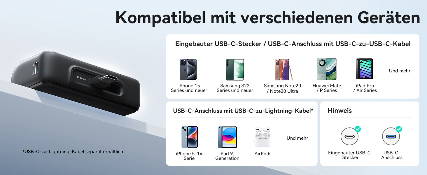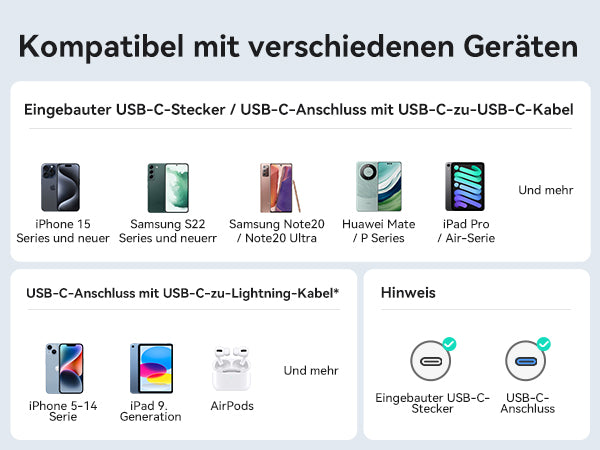 - [Tragbares USB-C-Laden] Mit dem USB-C-Anschluss und -Stecker können Sie zwei Geräte gleichzeitig aufladen oder Ihr Gerät aufladen, während es über die Pass-Through-Ladetechnologie aufgeladen wird.