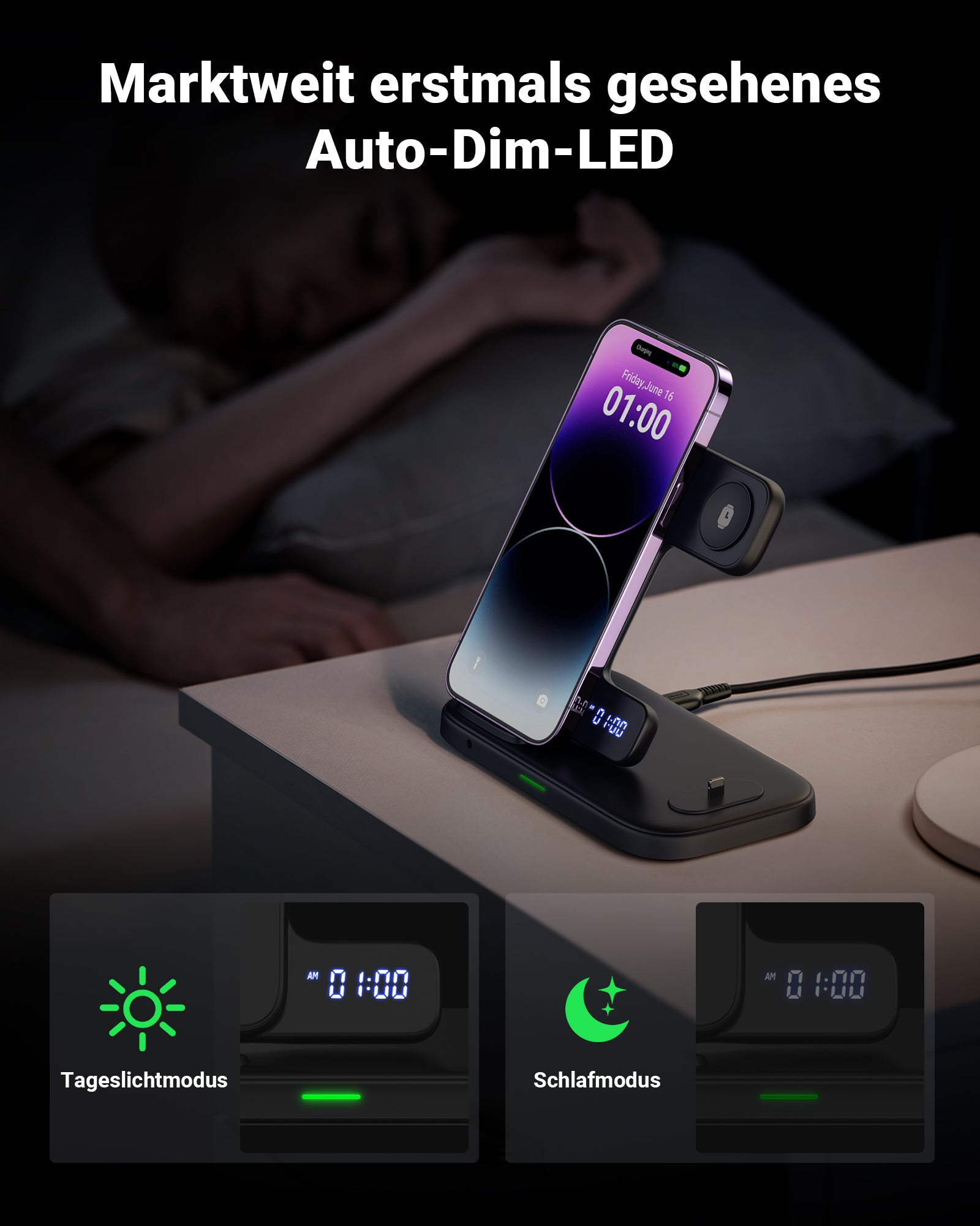 Mit der erstmals vorgestellten adaptiven Zeitanzeige und -anzeige können Sie Uhrzeit und Ladestatus überprüfen, ohne Ihr Telefon in die Hand nehmen zu müssen. Außerdem passen sie ihr Licht automatisch an die Umgebungsbedingungen an, sodass Sie während Ihres Schönheitsschlafs kein störendes Licht haben.